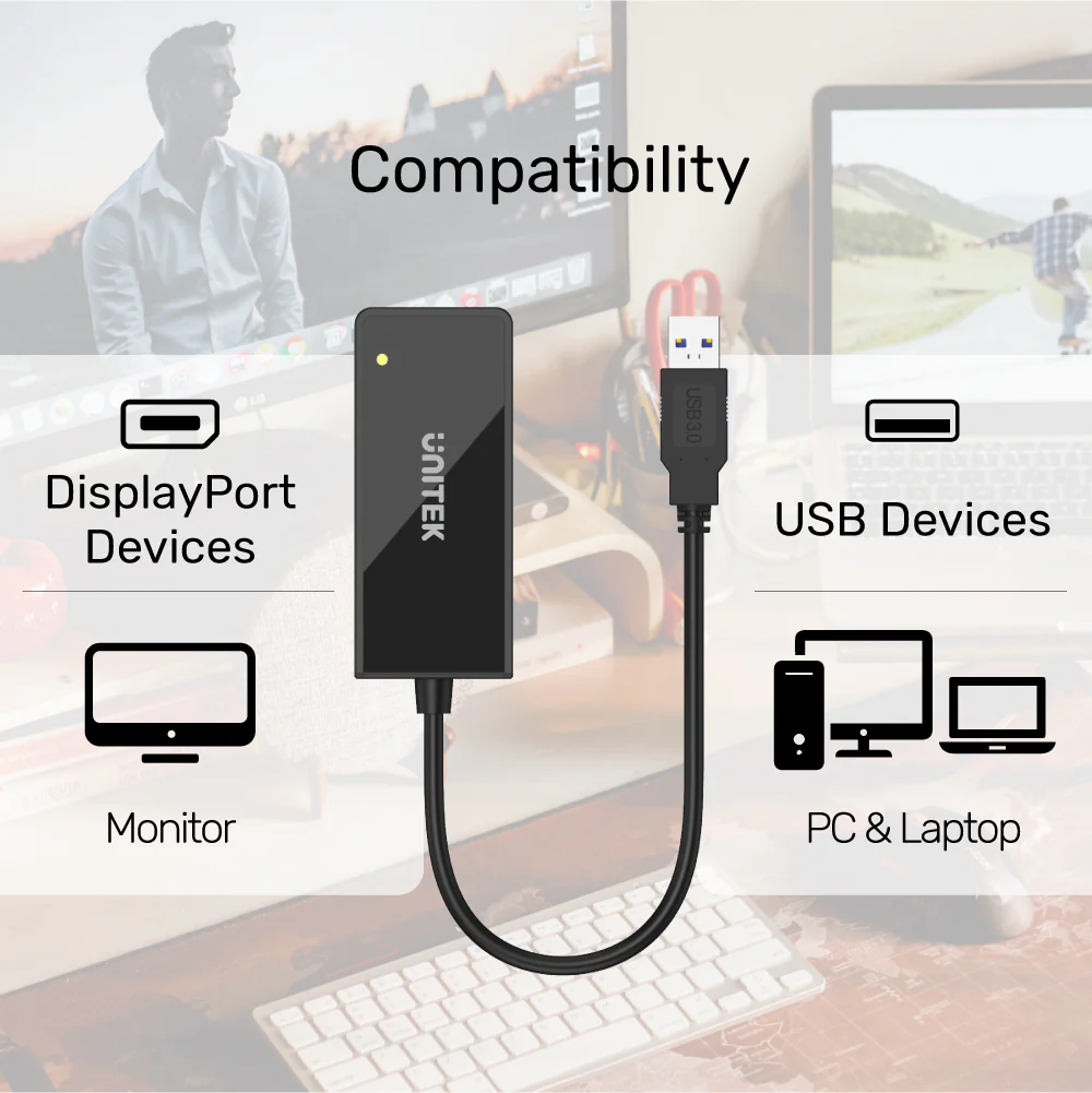 - Cáp chuyển đổi USB 3.0 sang DisplayPort UNITEK Y-3703 giúp mở rộng màn hình dễ dàng từ máy tính/laptop ra màn hình rời qua cổng DisplayPort.