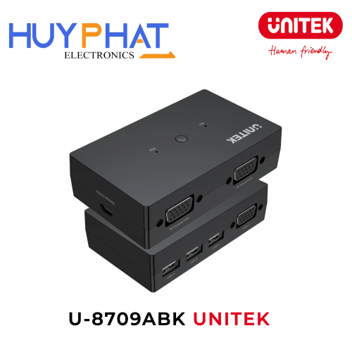 - Bộ chuyển mạch KVM UNITEK U-8710ABK cho phép chia sẻ một màn hình VGA và ba cổng USB để điều khiển 4 máy tính hoặc TV Box chỉ bằng một nút bấm chuyển đổi nhanh chóng.