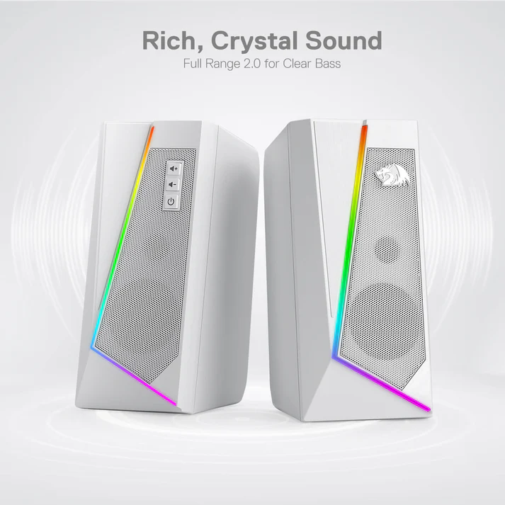 Thiết kế tối giản, hiện đại: Thân loa màu trắng với bề mặt giả chải (brushed texture), hài hòa với không gian làm việc / gaming