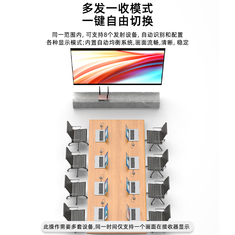 - Có thể kết nối tối đa 8 bộ thu phát đồng thời, đầu ra kép HDMI + VGA.