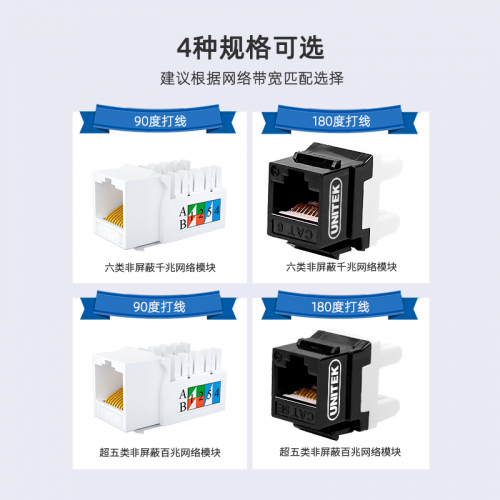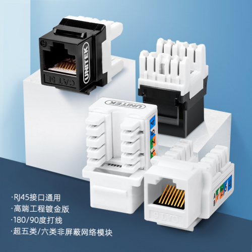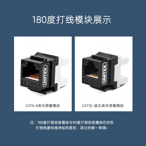 - Mô-đun mạng UNITEK T011A là mô-đun đấu dây 90 độ loại Cat5e không được bọc chống nhiễu (unshielded).