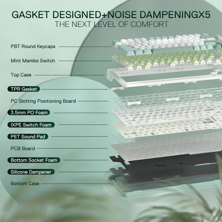 Cấu trúc Gasket mount cao cấp cùng 5 lớp foam chống ồn (PO foam, IXPE switch foam, PET sound pad, foam socket dưới, silicone bottom pad) mang lại cảm giác gõ êm ái, giảm tối đa tiếng ồn và phản hồi rất “êm tay”.