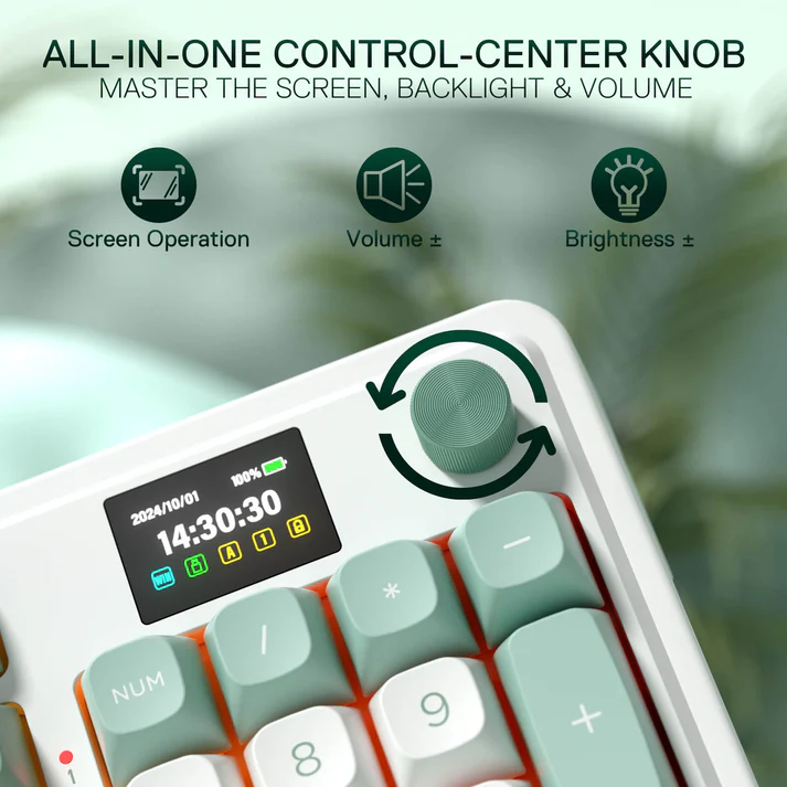 Màn hình LCD TFT thông minh + núm điều khiển (knob) cho phép hiển thị tình trạng pin, chế độ kết nối, thời gian, thậm chí GIF vui nhộn; đồng thời knob hỗ trợ điều chỉnh âm lượng, đèn nền, chơi/tạm dừng media trực quan.