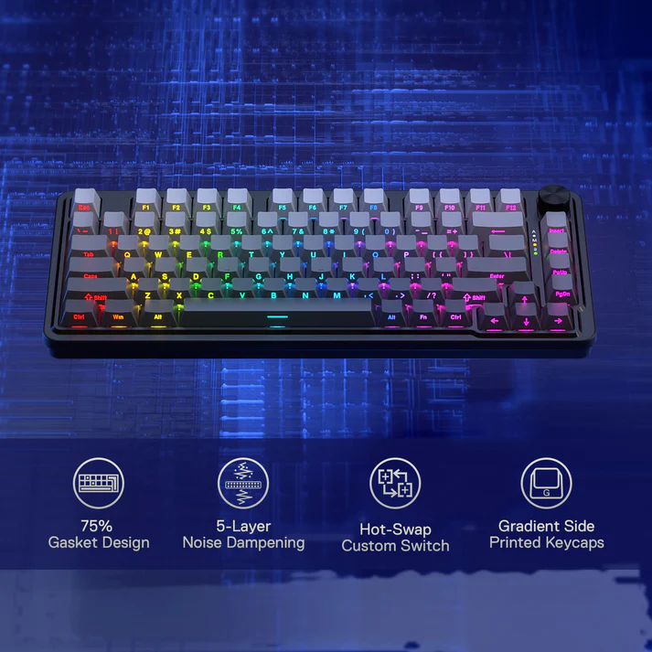 Keycaps làm từ PBT và in bên thân (side-printed), thường là gradient màu thú vị (chẳng hạn deep blue + white) tạo nét thẩm mỹ nổi bật . -