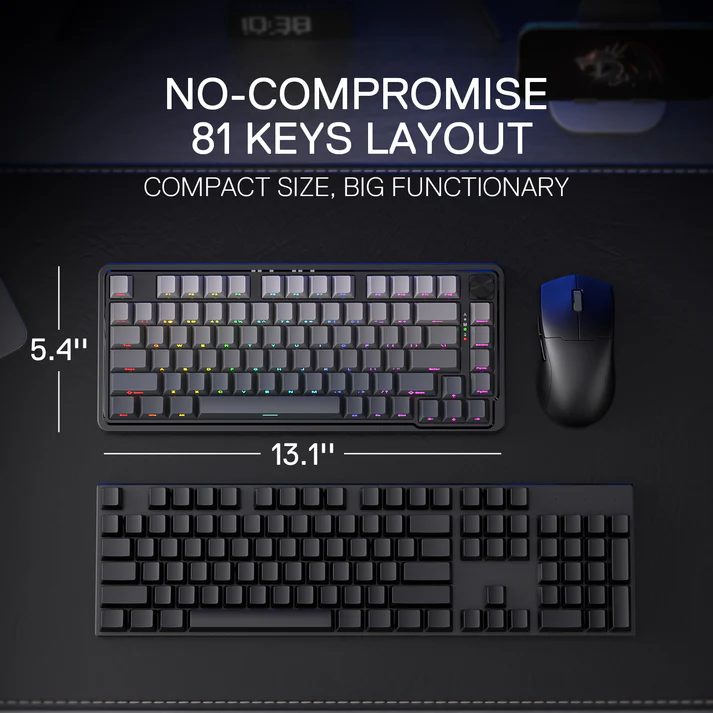Bàn phím cơ không dây kích thước 75% (81 phím), thiết kế dạng gasket giúp giảm âm và tạo cảm giác gõ mềm mại . -