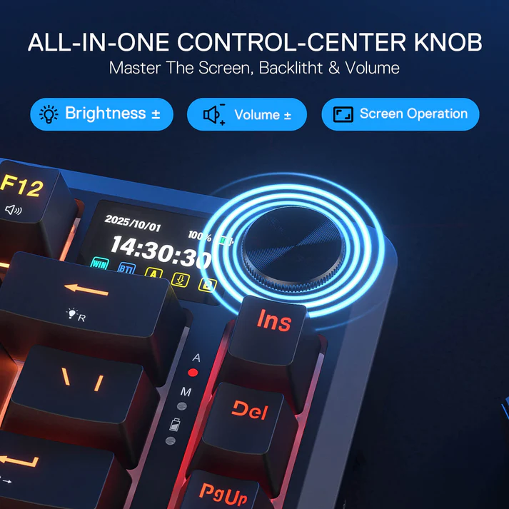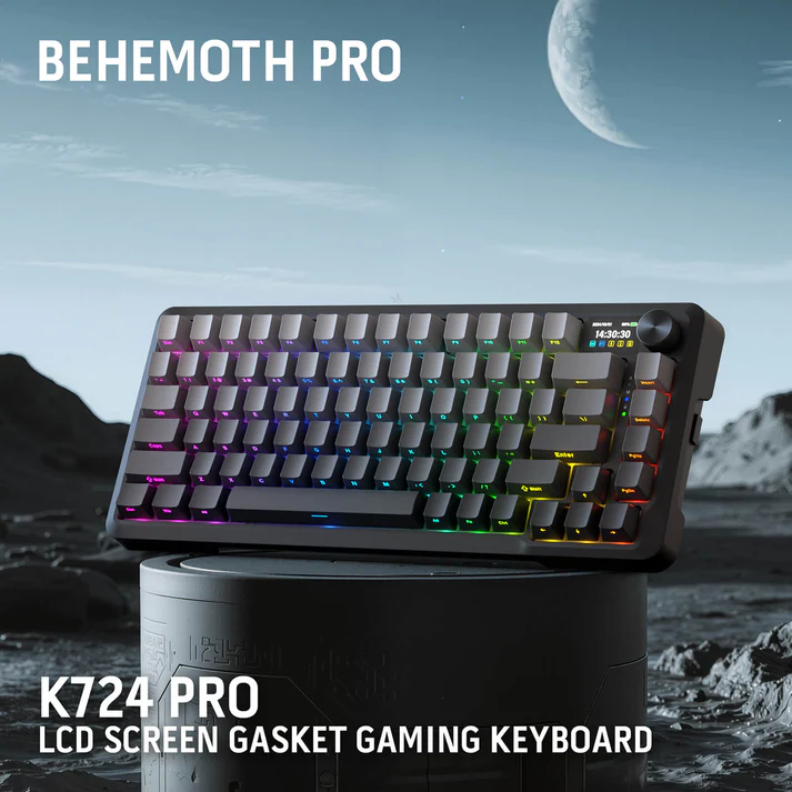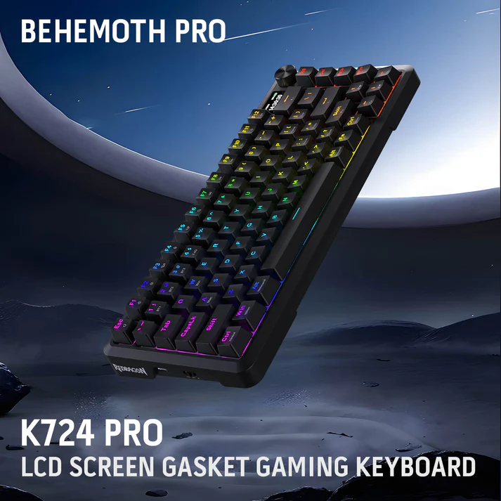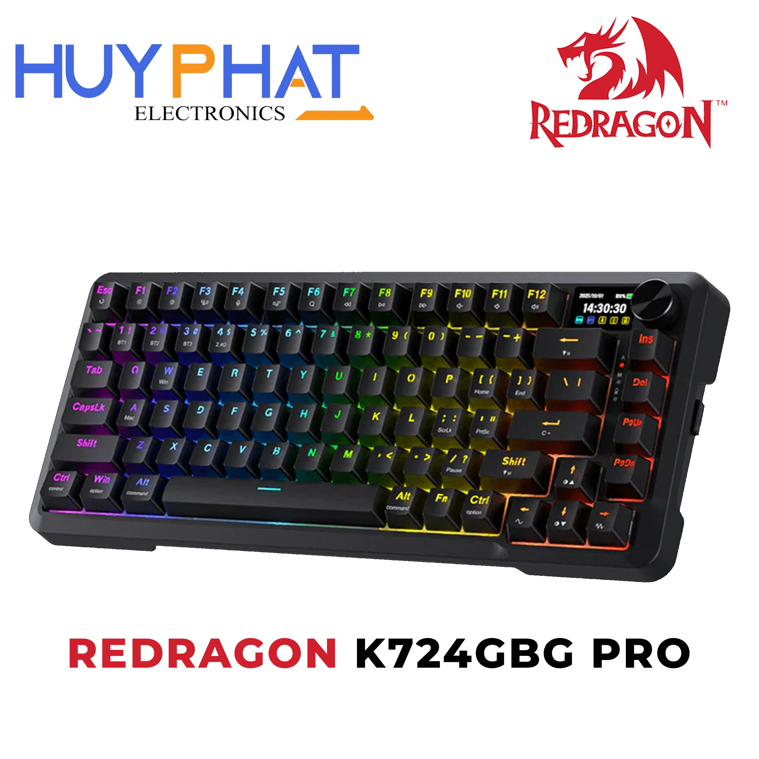 Bàn phím Redragon Behemoth K724 Pro là chiếc bàn phím chơi game cao cấp với thiết kế 75% (81 phím), mang lại sự gọn gàng mà vẫn đầy đủ chức năng. Điểm nhấn bao gồm màn hình LCD TFT, nắc điều khiển media, và khả năng kết nối linh hoạt 3 chế độ (có dây USB-C, không dây 2.4 GHz và Bluetooth).