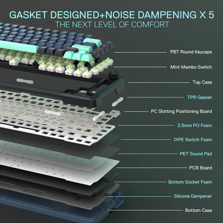 Cảm giác gõ mượt mà và êm dịu nhờ switch Mint Mambo đã được bôi trơn kỹ, kết hợp với cấu trúc Gasket mount và 5 lớp chống ồn, giúp giảm tối đa tiếng ồn khi gõ. Thiết kế hot-swap sockets cho phép thay switch dễ dàng, cùng keycap PBT profile OEM bền bỉ. Hơn nữa, bàn phím còn hỗ trợ phần mềm tùy chỉnh hiệu ứng đèn, macro và chế độ hiển thị trên màn hình TFT.
