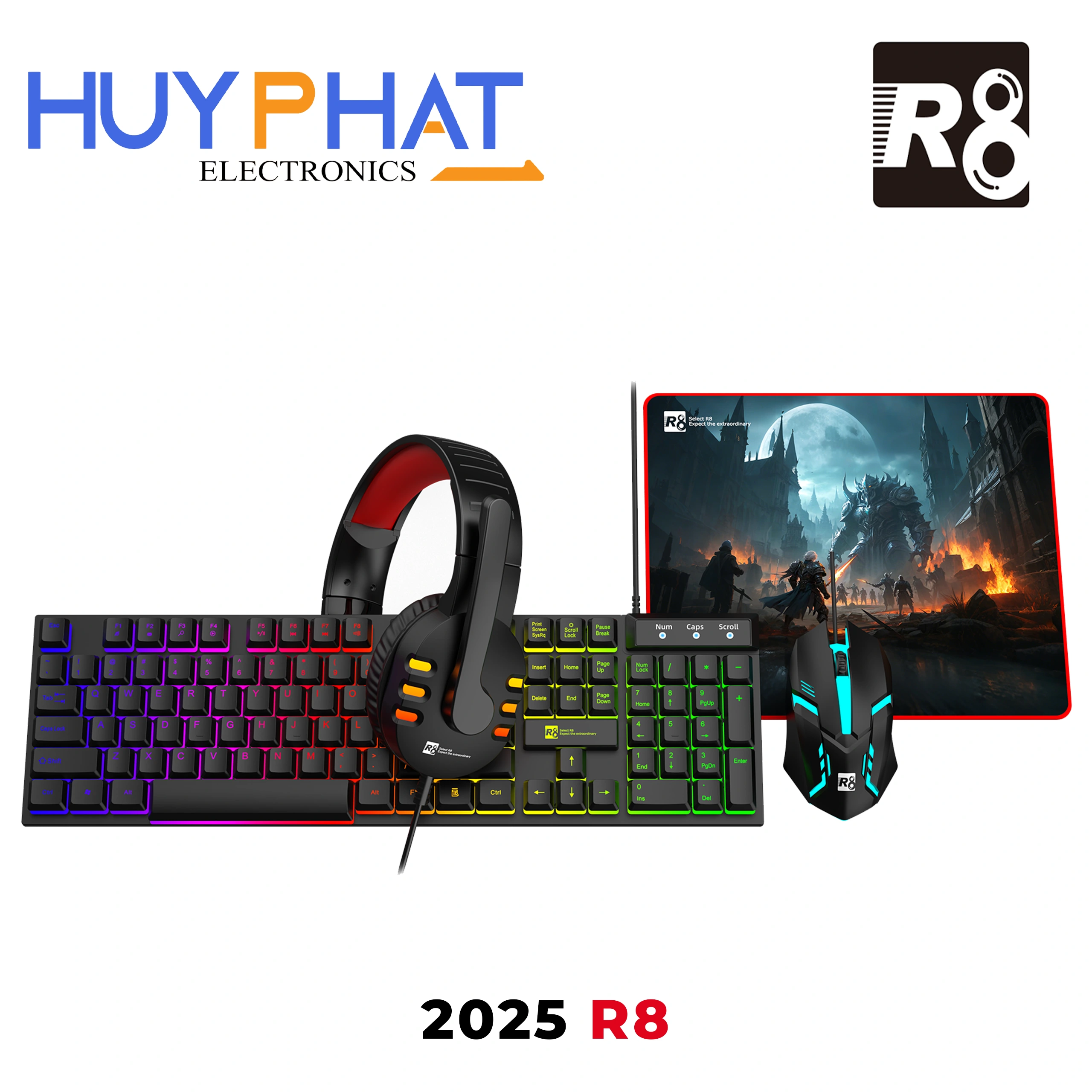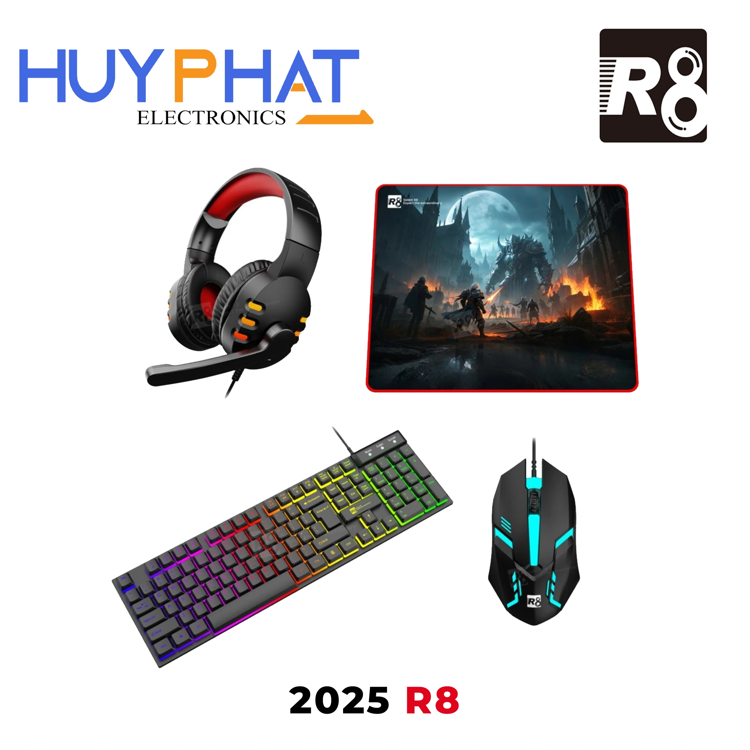 Bộ bàn phím + chuột + Mousepad + Tai nghe R8 2025