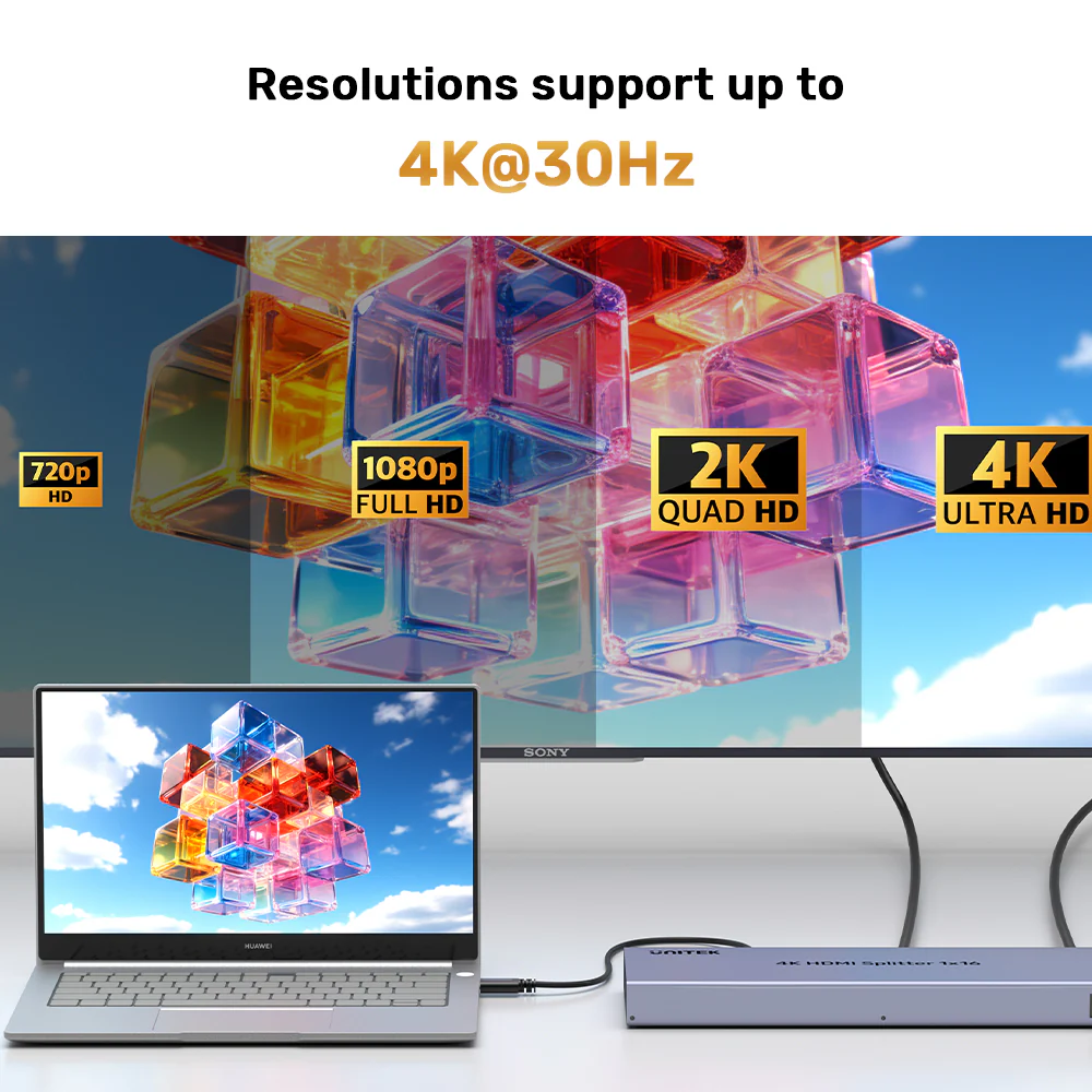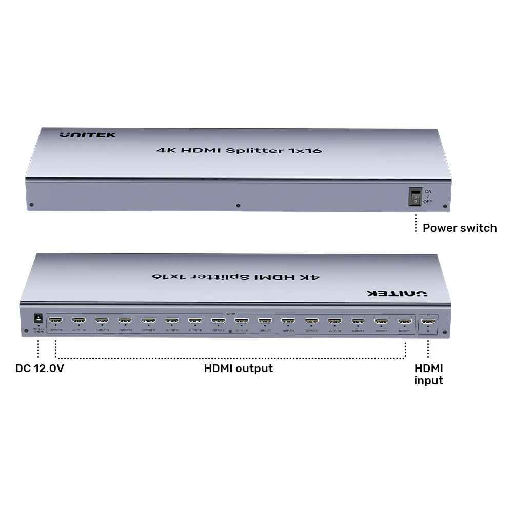 - Bộ chia HDMI UNITEK V1137AGY01-EU cho phép nhân bản tín hiệu từ 1 cổng HDMI đầu vào ra 16 cổng đầu ra, giữ nguyên chất lượng hình ảnh và âm thanh.