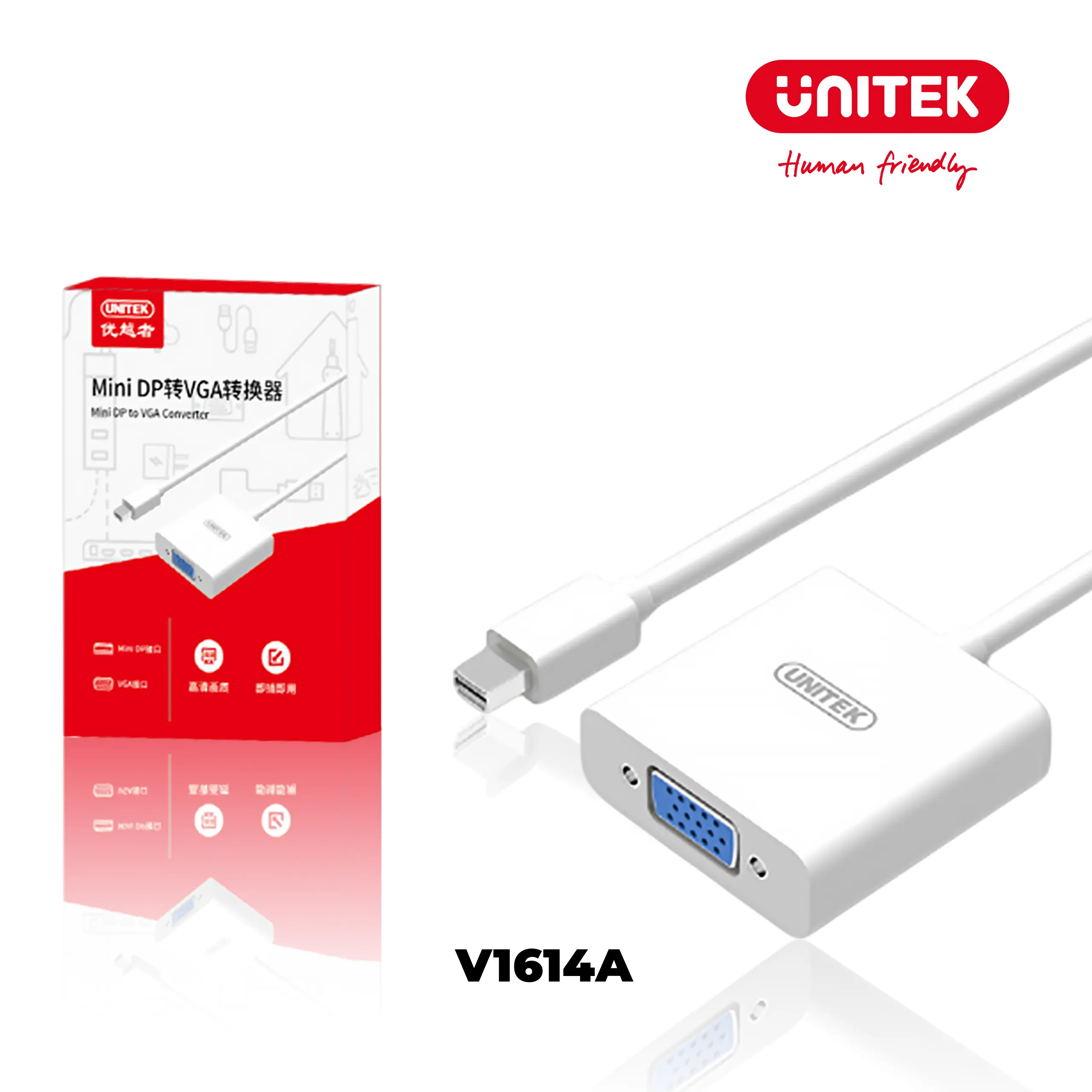 - Bộ chuyển đổi UNITEK V1614A cho phép kết nối thiết bị có cổng Mini DisplayPort (M) với màn hình, máy chiếu cổng VGA (F).