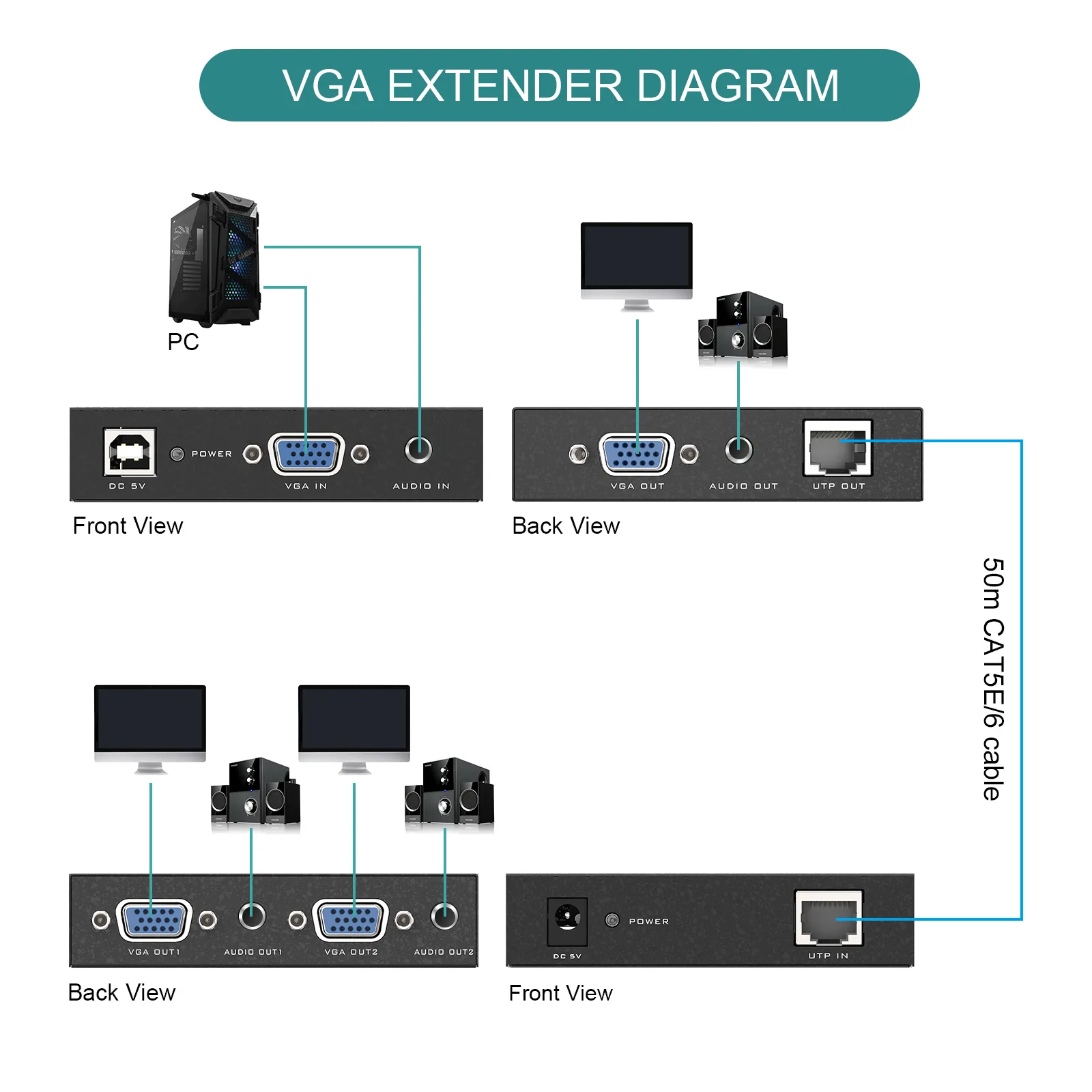 - Bộ chuyển VGA qua cáp mạng Cat6, hỗ trợ truyền tín hiệu lên đến 200 mét.