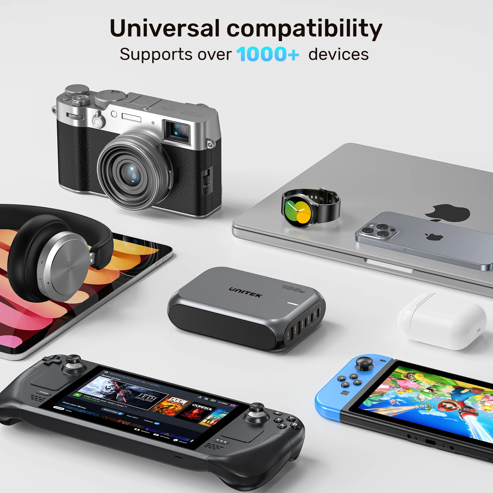- Sạc GaN 5 cổng cao cấp với chân đế tiện lợi, hỗ trợ sạc nhanh cho nhiều thiết bị cùng lúc.