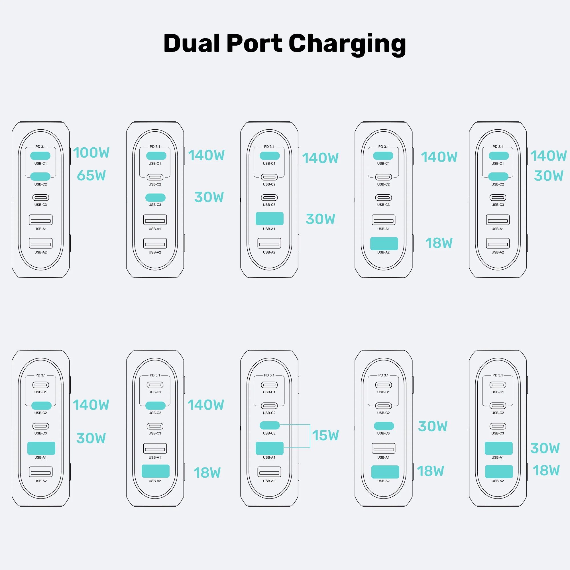 | Cổng ra | USB-A1: 30W max (5V=3A, 9V=3A, 12V=2.5A, 20V=1.5A) USB-A2: 18W max (5V=3A, 9V=2A, 12V=1.5A) USB-C1/C2: 140W max (5V=3A, 9V=3A, 12V=3A, 15V=3A, 20V=5A, 28V=5A) USB-C3: 33W max (5V=3A, 9V=3A, 12V=2.5A, 15V=2A, 20V=1.5A) Hỗ trợ nhiều tổ hợp chia tải (PD100W + PD65W, PD140W + PD30W, v.v...) |